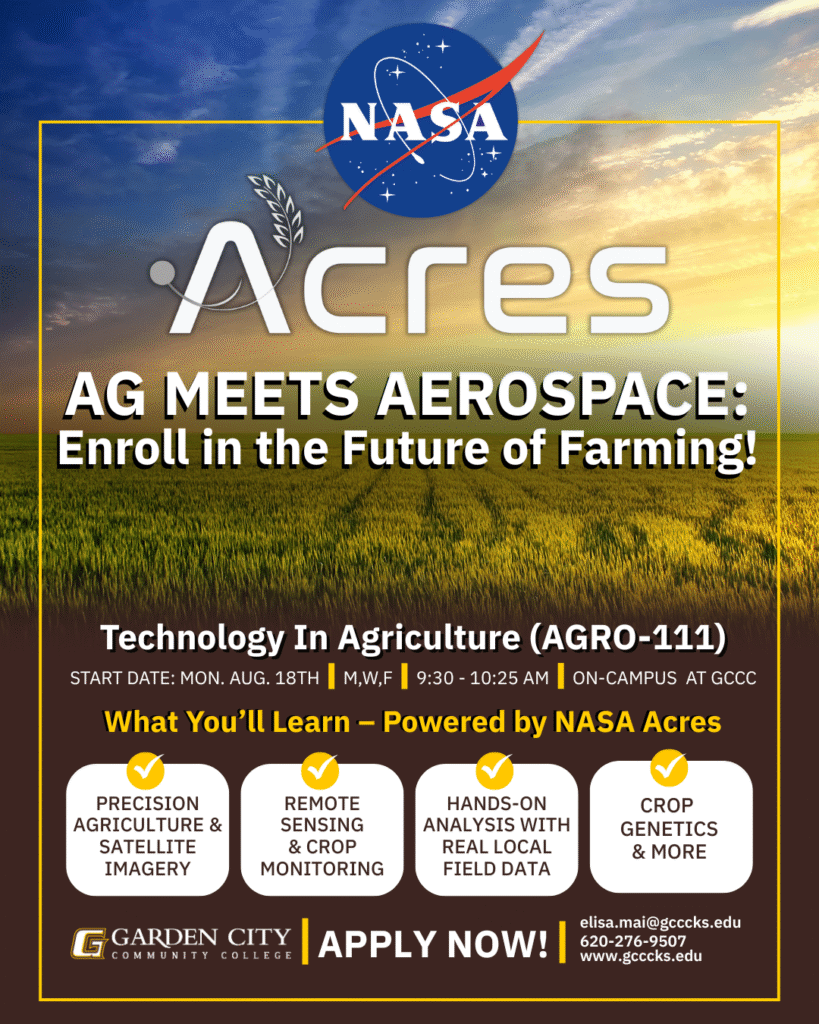 Garden City Community College’s Crop Production program is proud to announce the launch of a new course, Technology in Agriculture, in collaboration with NASA Acres, NASA’s national initiative focused on advancing agricultural innovation through Earth observation technology. The course is designed to immerse students in the cutting-edge tools that are transforming today’s agricultural industry.