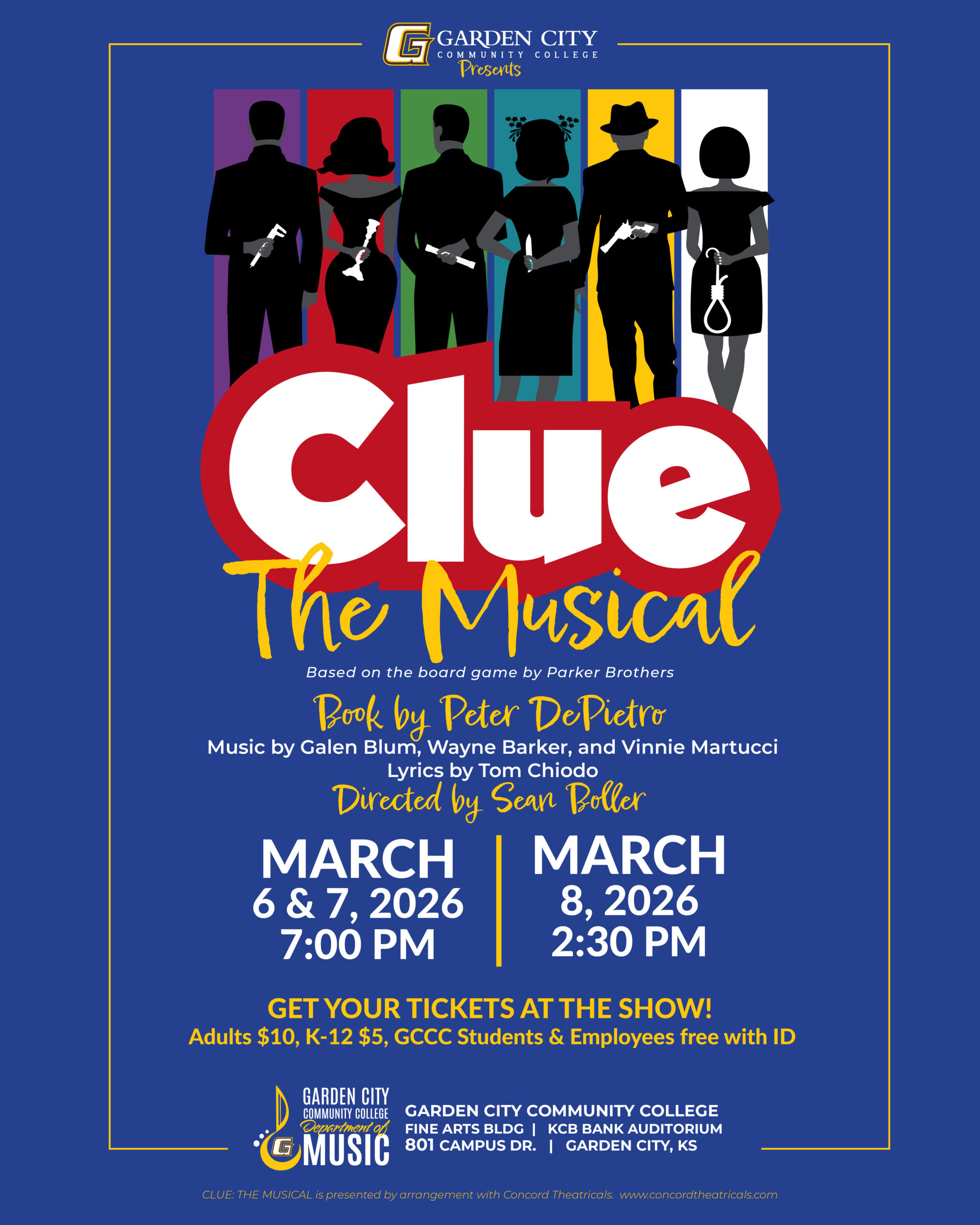 The Garden City Community College Music Department will present its spring production, CLUE: The Musical, at 7 p.m. March 6–7 with a matinee at 2:30 p.m. March 8 in the KCB Bank Auditorium inside GCCC’s Pauline Joyce Fine Arts Building.