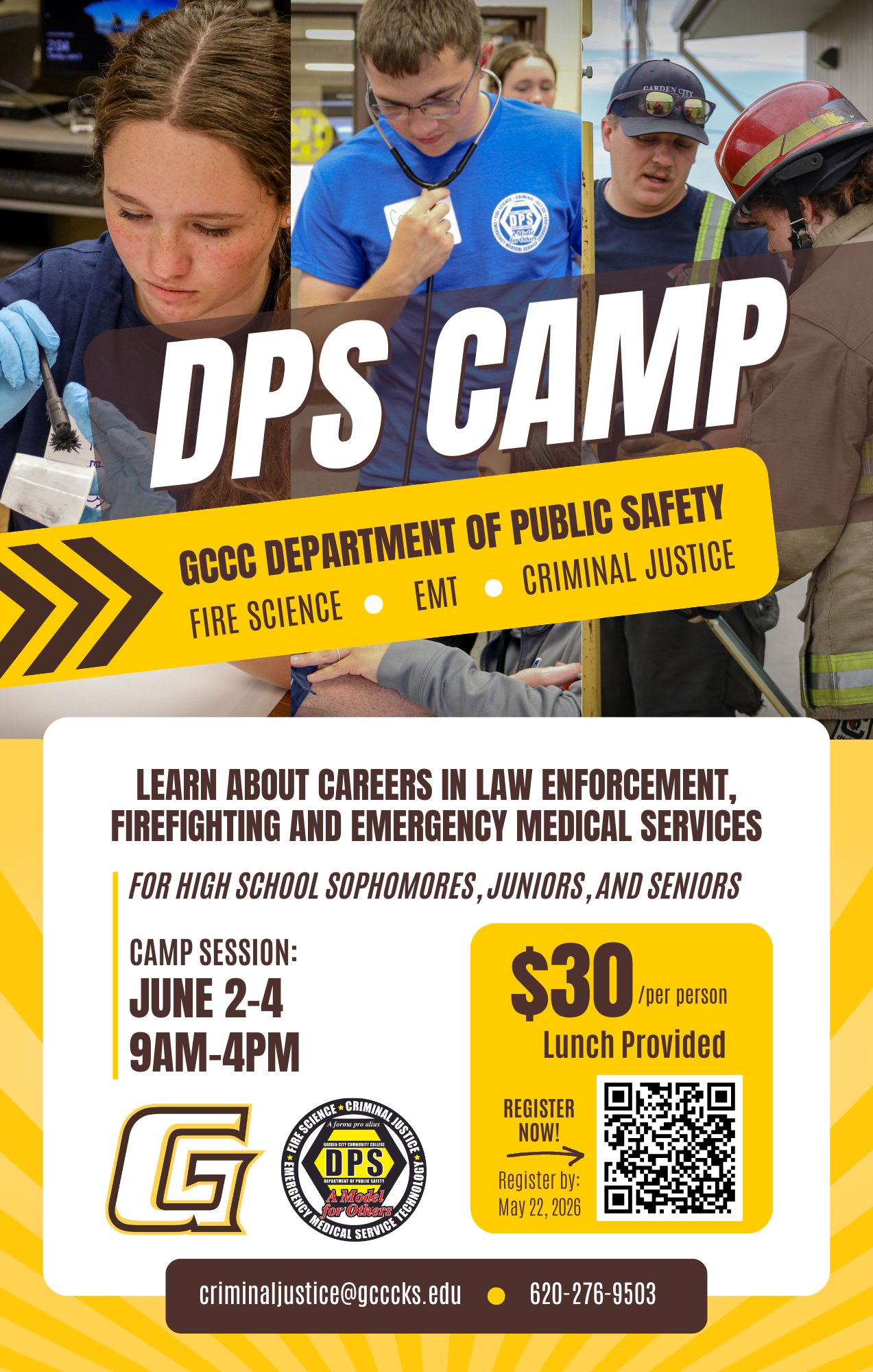 The Garden City Community College Department of Public Safety invites high school sophomores, juniors, and seniors to a hands-on, three-day summer camp from June 2–4.